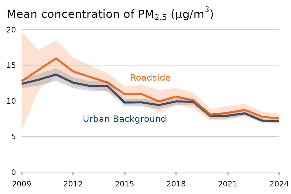In general, annual mean concentrations of PM2.5 at the roadside have decreased from 12.8 µg/m3 in 2009 to 7.5 µg/m3 in 2024, the lowest level recorded. The decline in concentrations of PM2.5 at roadside sites approximately follows the trends seen for PM10 at roadside sites (PM2.5 is a subset of PM10).