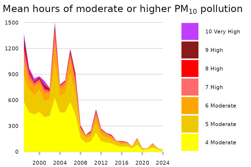 At urban background sites the mean number of hours where PM10 concentrations exceeded the ‘Moderate’ threshold for a monitoring site showed a decrease of 99 per cent between 1992 and 2024 to 11 hours; they decreased by an average of 35 hours per year over this period.