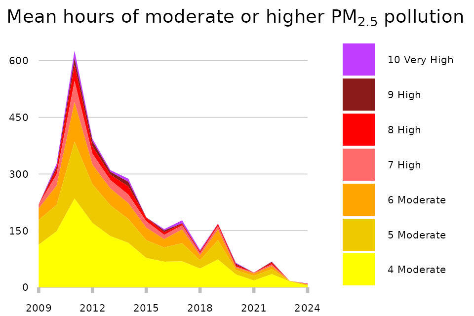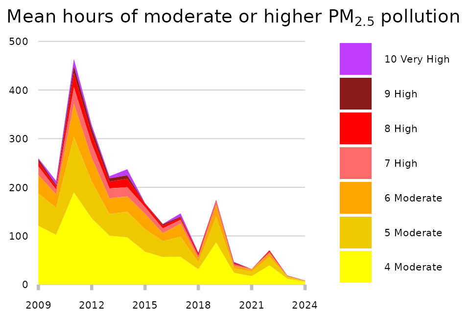At urban background sites the mean number of hours where PM2.5 concentrations exceeded the ‘Moderate’ threshold for a monitoring site showed a decrease of 98 per cent from the peak in 2011 to 8 hours per site in 2024.