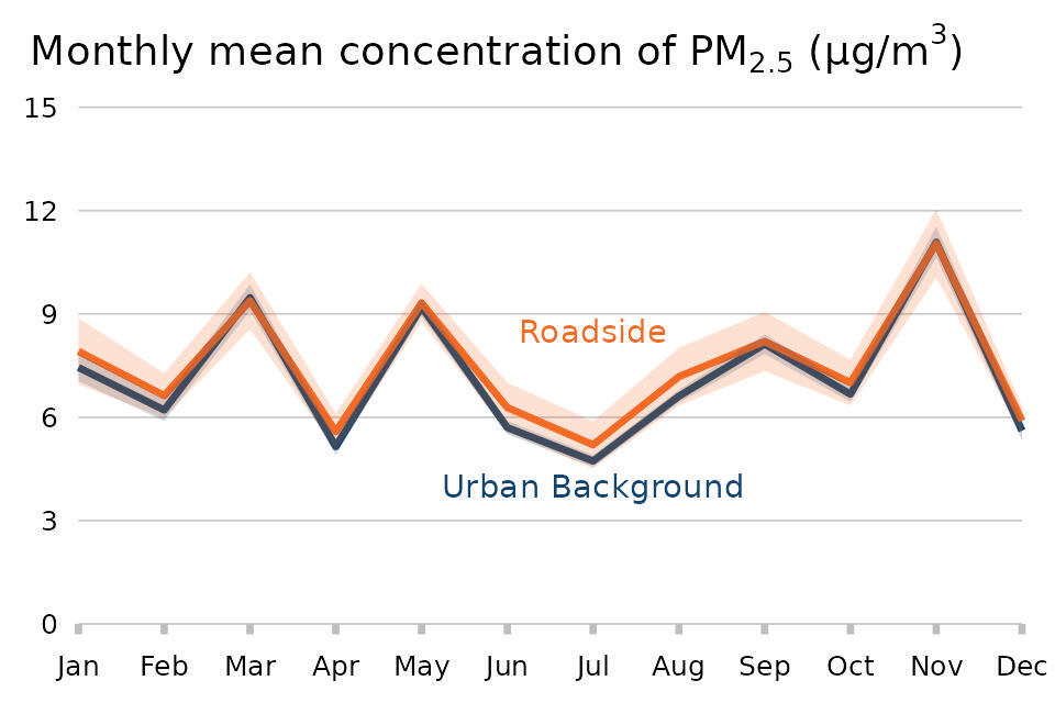 The PM2.5 index shows the monthly mean, averaged over all included sites that had monthly data capture greater than or equal to 75 per cent in a given year. The shaded areas represent the 95 per cent confidence interval for the monthly mean concentration for roadside sites and urban background sites.