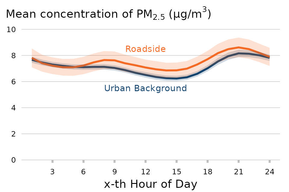 The PM2.5 index shows the hourly mean, averaged over all included sites that had data capture greater than or equal to 75 per cent for all instances of that hour in a given year. The shaded areas represent the 95 per cent confidence interval for the hourly mean concentration for roadside sites and urban background sites.