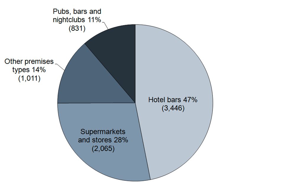 Premises with 24-hour alcohol licences by premises type; hotel bars 47% 3446, supermarkets and stores 28% 2065, other premises types 14% 1011, pubs bars and nightclubs 11% 831.
