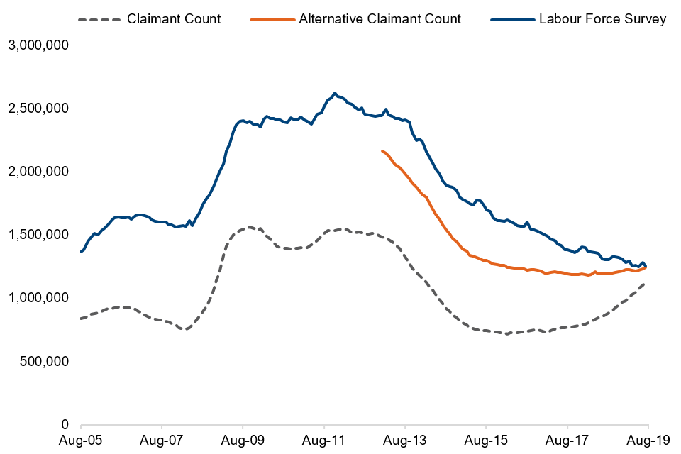Comparisons between Alternative Claimant Count, Claimant Count and Labour Force Survey, August 2005 to 2019, seasonally adjusted