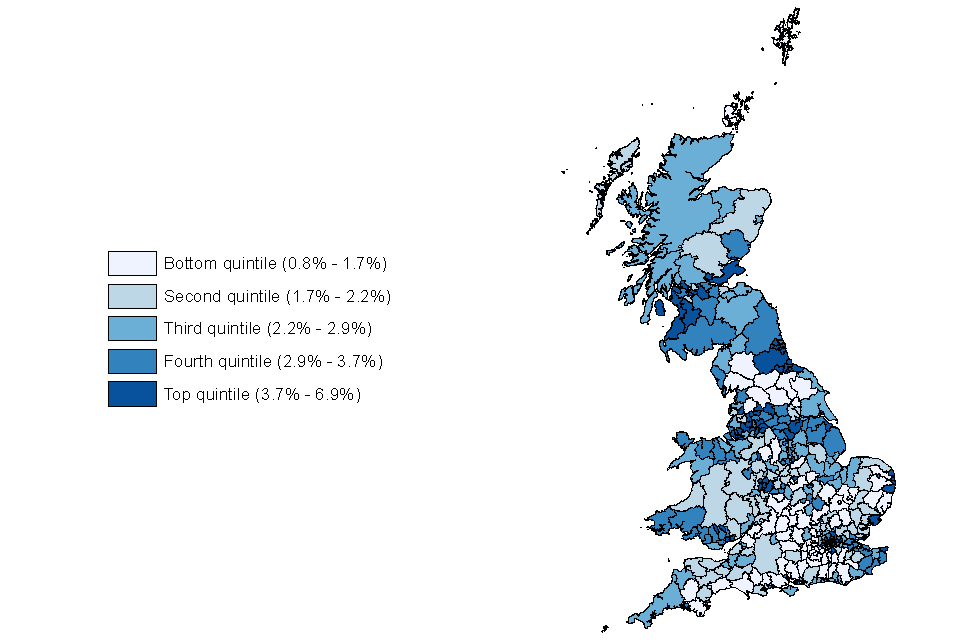 Figure 8 shows a number of areas in the top quintile including parts of the North East, southern parts of the North West, Yorkshire and the Humber, northern and southern parts of Wales, south western parts of Scotland and areas within the South East, Birmingham and London.