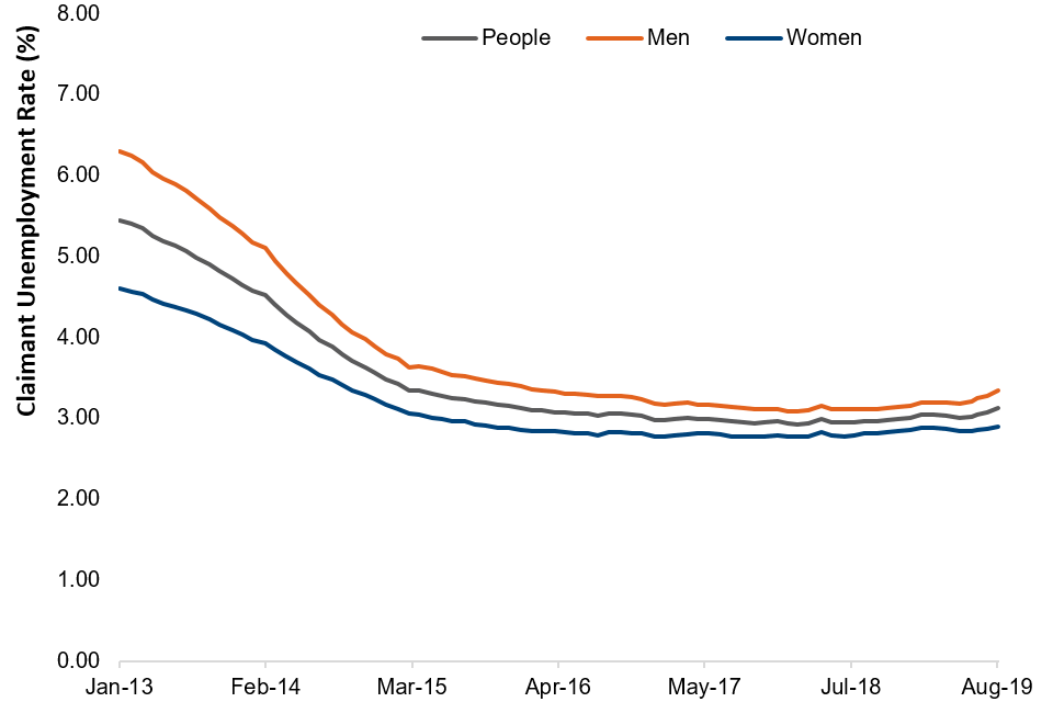 The claimant unemployment rate (as a proportion of the population aged 16 to 64) in August 2019 was 3.1%.