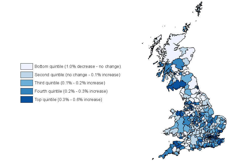 Figure 9: Change in claimant unemployment rate by local authority (quintiles), August 2018 to August 2019, not seasonally adjusted