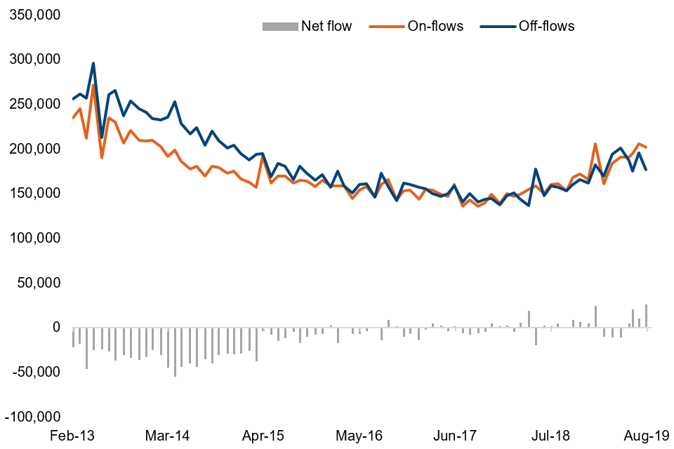 Figure 10: Flows between claimant unemployment, February 2013 to August 2019, standardised and seasonally adjusted