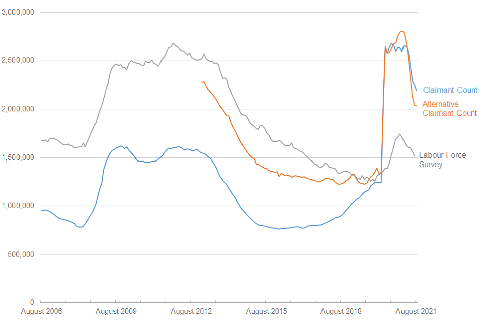 Comparisons between Alternative Claimant Count, ONS Claimant Count and Labour Force Survey, United Kingdom, August 2006 to August 2021, seasonally adjusted.