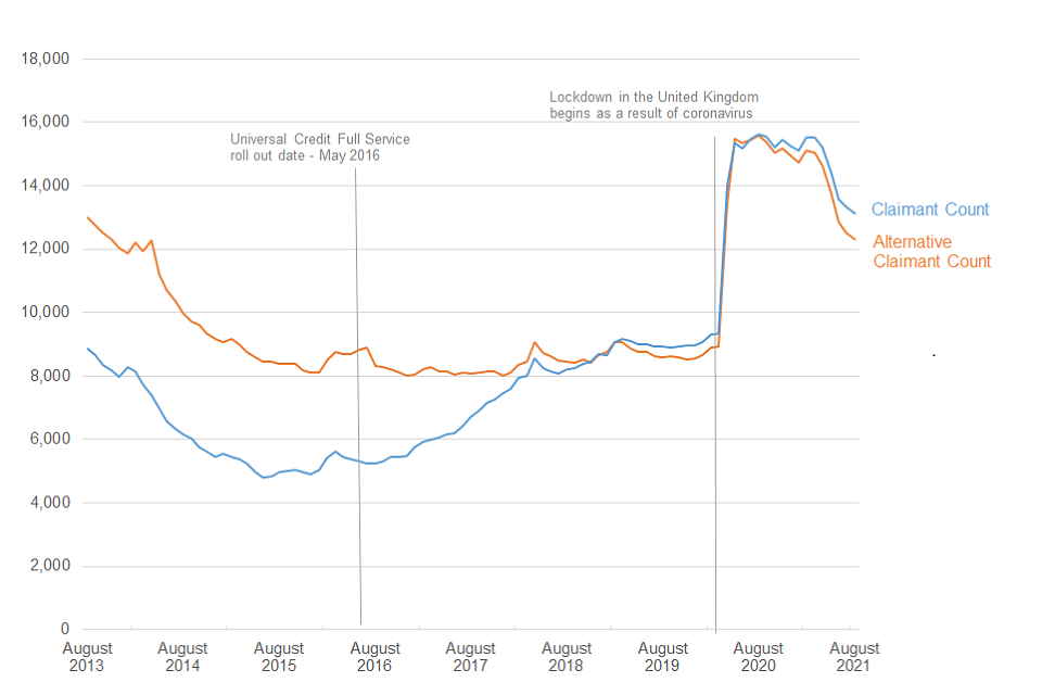 Compared to the ONS Claimant Count, the alternative series provides a more consistent measure of trends in national and local levels of claimant unemployment over time irrespective of the rollout of Universal Credit. The ONS Claimant Count continues to provide an accurate count, at a point in time, of the number of people claiming unemployment related benefits.