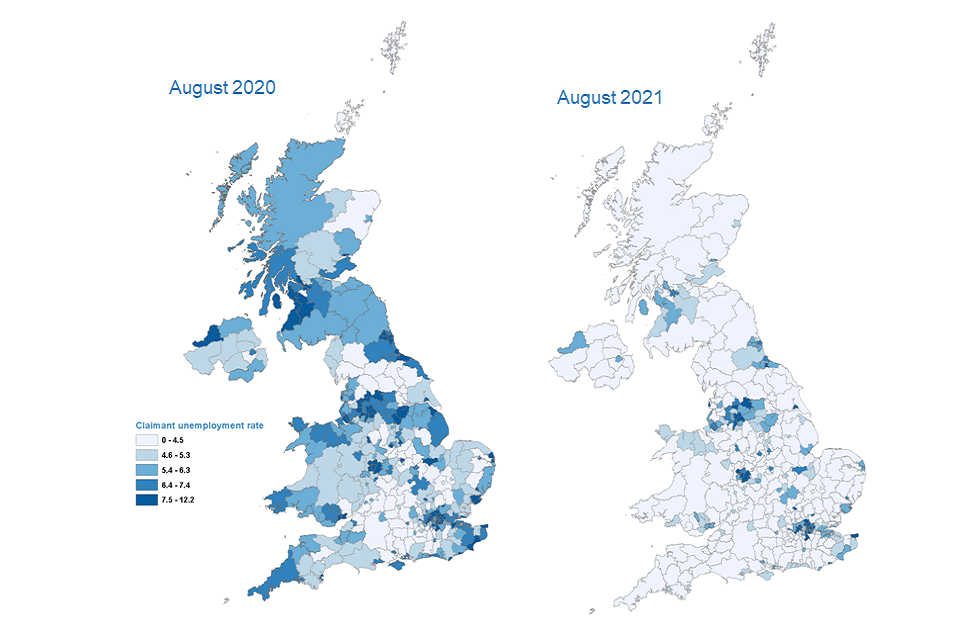 - all local authorities saw a decrease in the claimant unemployment rate between August 2020 and 2021