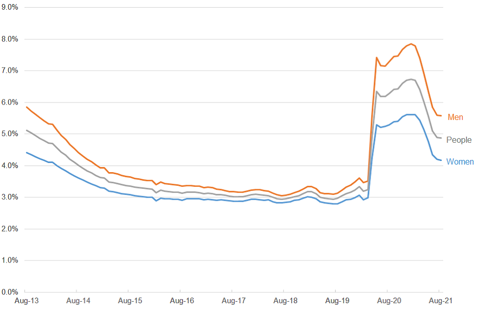 The overall rate of people claiming unemployment related benefits as a proportion of the resident population aged 16 to 64 in August 2021 was 4.9%, a fall of 1.4 percentage points compared to August 2020 (6.3%) and a rise of 1.7 percentage points compared to August 2016 (3.2%).