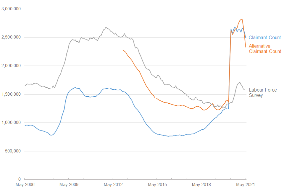 Comparisons between Alternative Claimant Count, ONS Claimant Count and Labour Force Survey, United Kingdom, May 2006 to May 2021, seasonally adjusted.