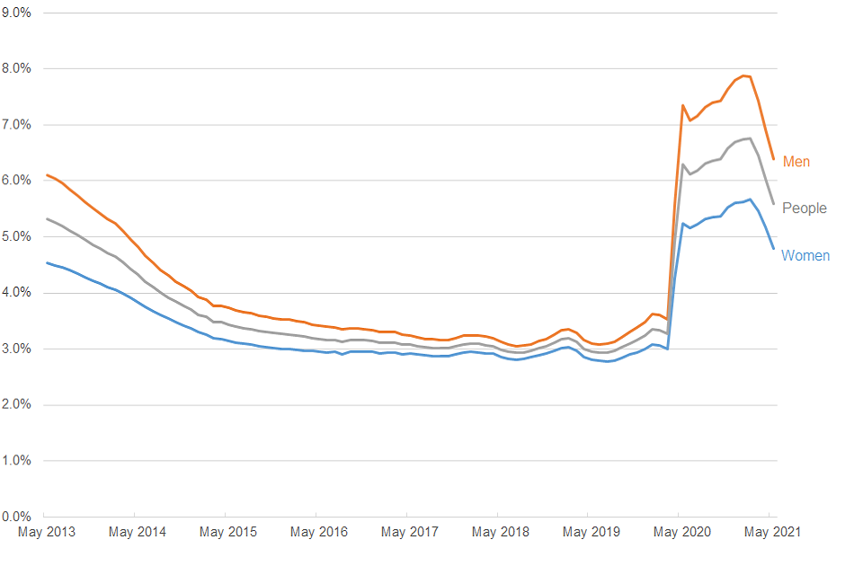 Monthly claimant unemployment rate by gender, United Kingdom, May 2013 to May 2021, seasonally adjusted.