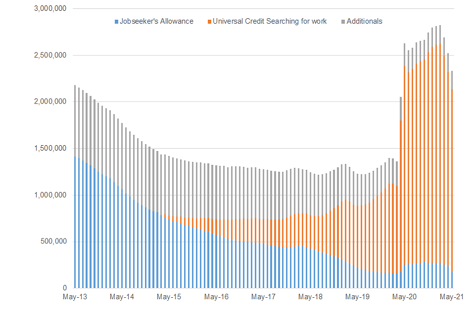 Number of people claiming unemployment related benefits by type of claimant, United Kingdom, May 2013 to May 2021, seasonally adjusted.