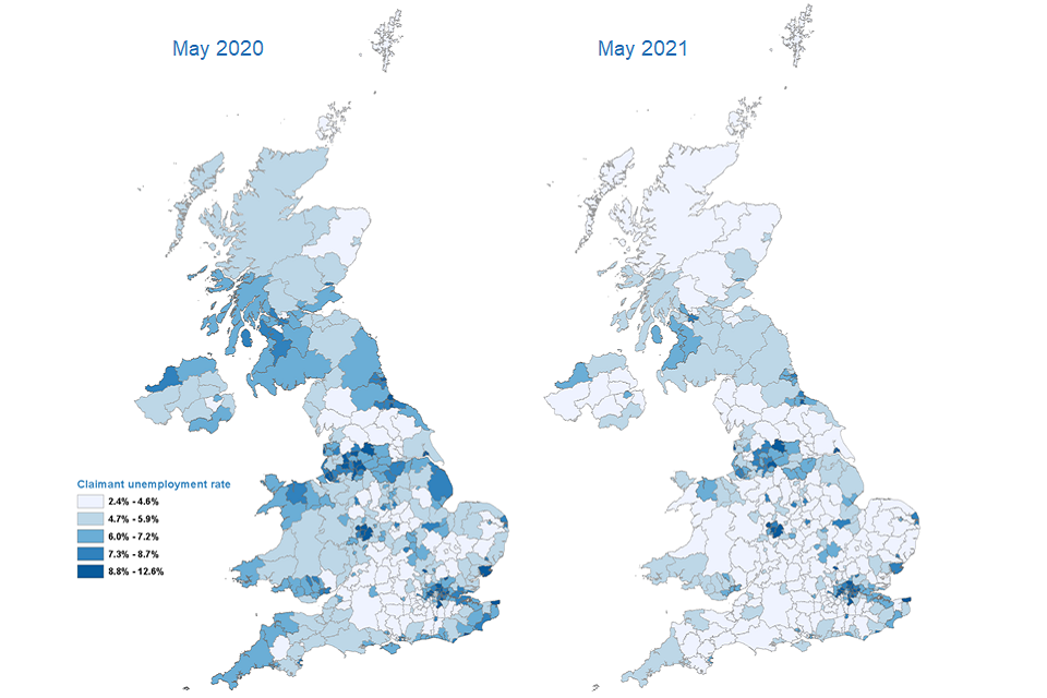 - more than 9 out of 10 local authorities saw a decrease in the claimant unemployment rate between May 2020 and 2021