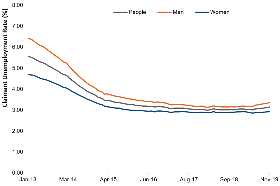 The claimant unemployment rate (as a proportion of the population aged 16 to 64) in November 2019 was 3.2%.