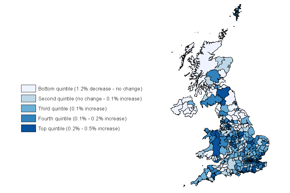 Figure 9: Change in claimant unemployment rate by local authority (quintiles), United Kingdom, November 2018 to November 2019, not seasonally adjusted