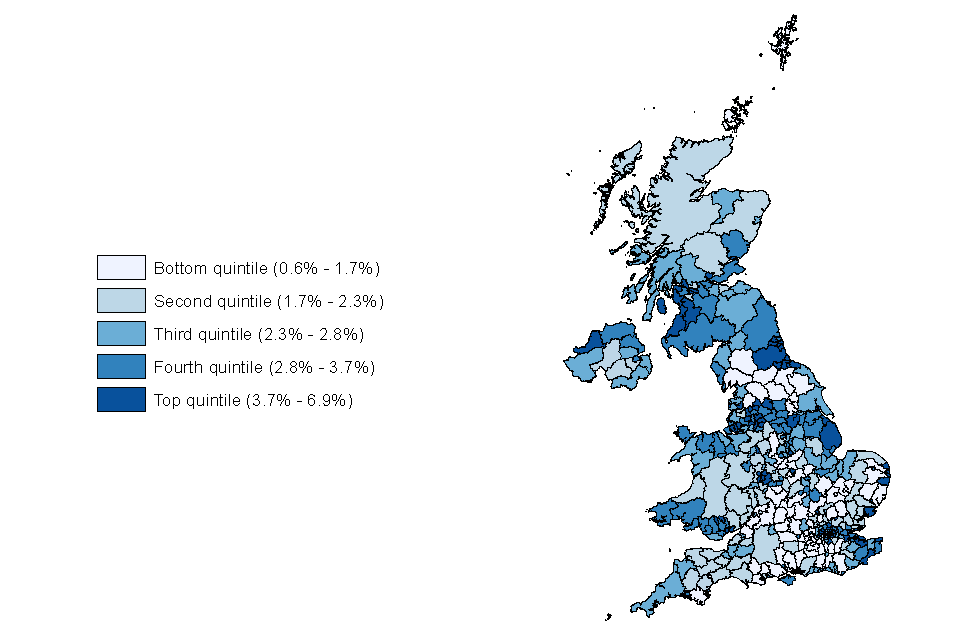 The top quintile (dark blue) shows the group of local authorities which have the highest claimant unemployment rates in the United Kingdom. This view allows for better comparison of claimant unemployment rates across local authorities irrespective of the rollout of Universal Credit.