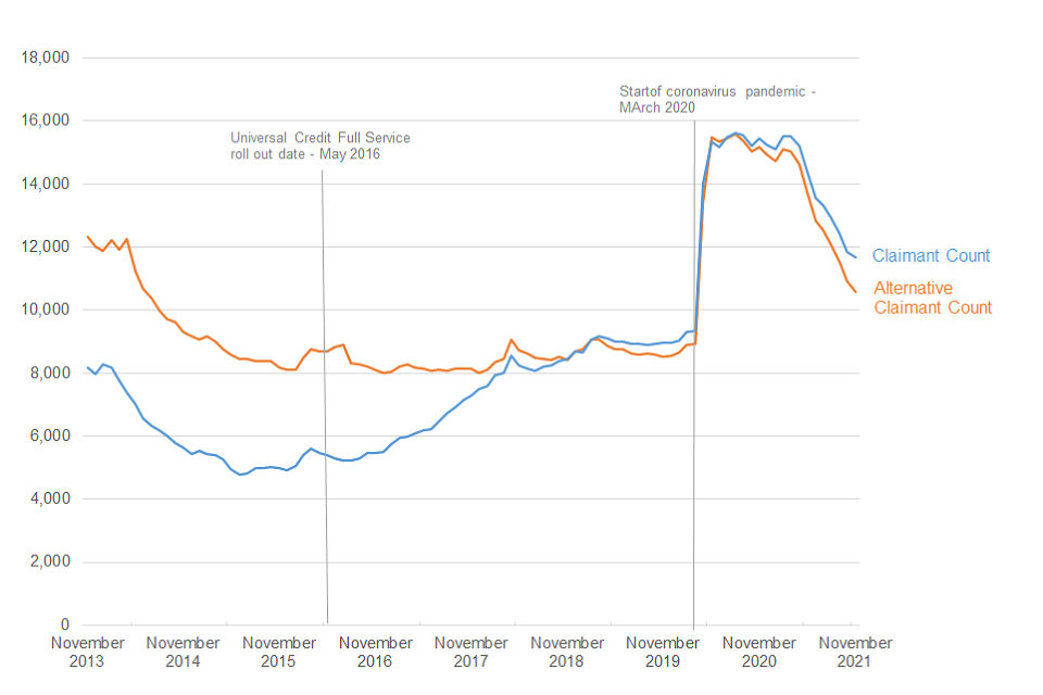 Compared to the ONS Claimant Count, the alternative series provides a more consistent measure of trends in national and local levels of claimant unemployment over time irrespective of the rollout of Universal Credit. The ONS Claimant Count continues to provide an accurate count, at a point in time, of the number of people claiming unemployment related benefits.