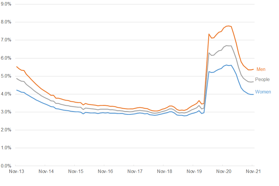 The claimant unemployment rate (as a proportion of the population aged 16 to 64) in November 2021 was 4.7%. The rate has decreased by 1.9 percentage points from November 2020. In the five years from November 2016, the rate has increased by 1.5 percentage points.