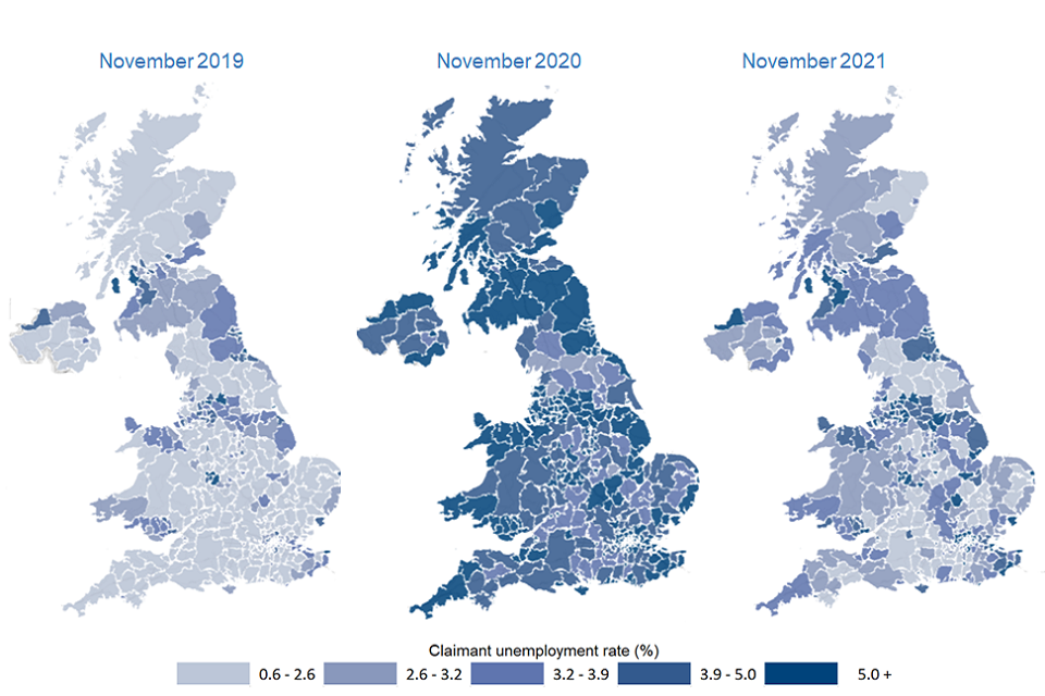 - the highest claimant unemployment rate in November 2021 was for London at 6.3%