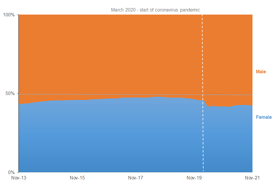 1.13 million (57%) were male and 833,000 (43%) were female – in comparison, males represented 58% in November 2020