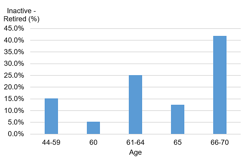 Data from the Annual Population Survey shows that, of the people who retired in 2017, 41.9% were aged 66 to 70. 20.5% were aged 44 to 60, 25.1% were aged 61 to 64 and 12.5% were age 65.