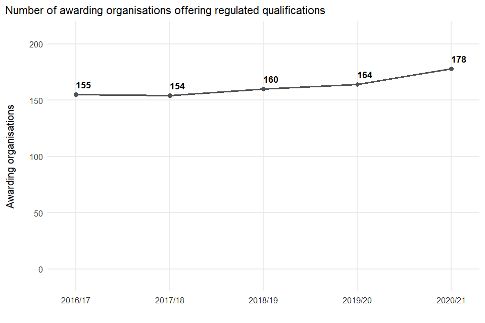 There were 178 Ofqual recognised awarding organisations during the 2020 to 2021 academic year. This number includes 32 awarding organisations which had no active qualifications (available qualifications with certificates) or delivered EPAs for apprenticeship standards only during the 2020 to 2021 academic year.