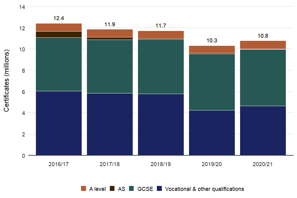 The total number of certificates awarded for all qualifications (A level, AS, GCSE and vocational and other qualifications) in the 2020 to 2021 academic year was 10.8 million, up 4.3% compared to the previous year.