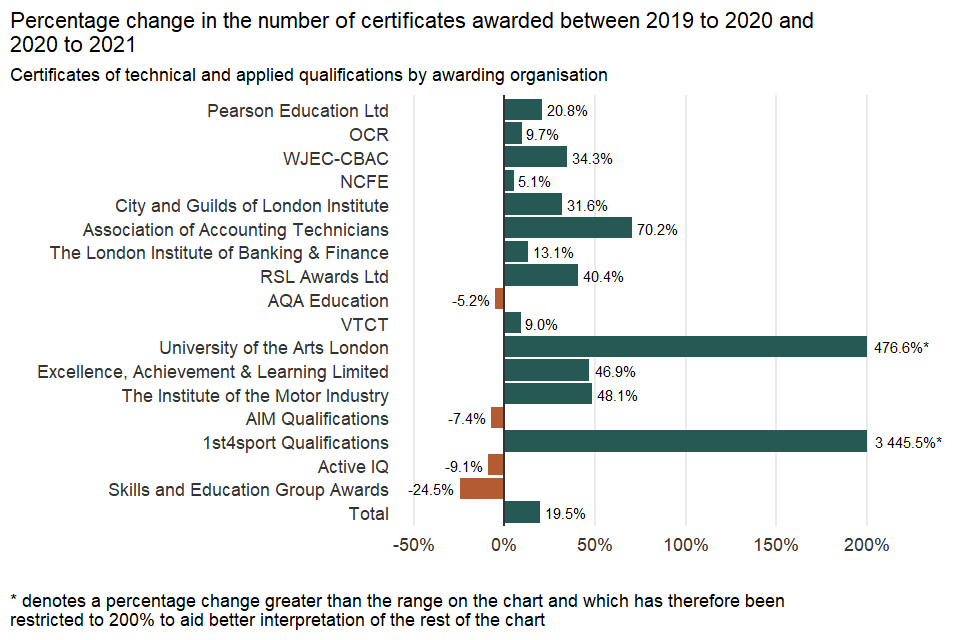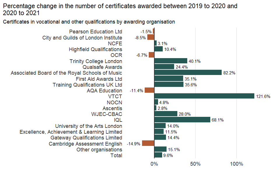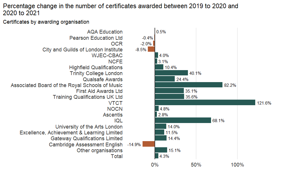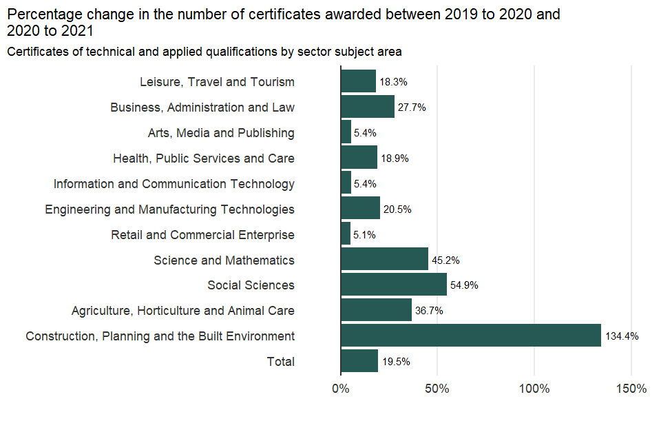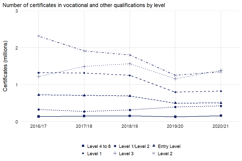 There were 4.7 million certificates awarded for vocational and other qualifications in the 2020 to 2021 academic year, up by 9.6% compared to the 2019 to 2020 academic year.