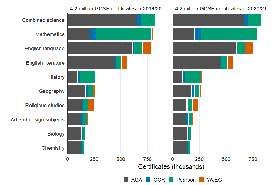 The overall number of certificates for GCSE qualifications has increased, by less than 1%. This is in line with a slight increase in the number of entries for GCSEs in the 2020 to 2021 academic year. Please note, all GCSEs awarded in the 2019 to 2020 and 2020 to 2021 academic years were reformed qualifications also known as GCSE (9 to 1).