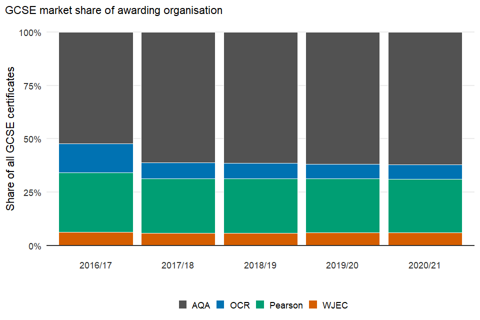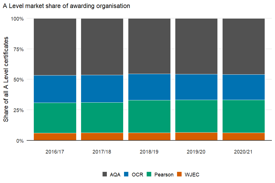 The awarding organisations with the largest market shares in the academic year 2020 to 2021 were AQA (35.0%), Pearson (21.9%), OCR (7.0%) and City & Guilds (5.1%); the rest of the 142 awarding organisations with active qualifications (excluding the ones offering EPAs only) accounted for 31.1% of the market.
