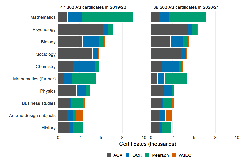 AS qualifications saw a decrease in the number of certificates (down by 19.4% compared to the 2019 to 2020 academic year). This is a continuation of the downward trend mainly attributable to the decoupling of AS from A levels as part of the government policy reforms.
