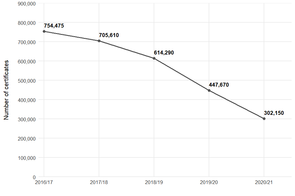 | Qualification type | Number of certificates in 2019 to 2020 | Number of certificates in 2020 to 2021 | Share of certificates in 2019 to 2020 | Share of certificates in 2020 to 2021 |