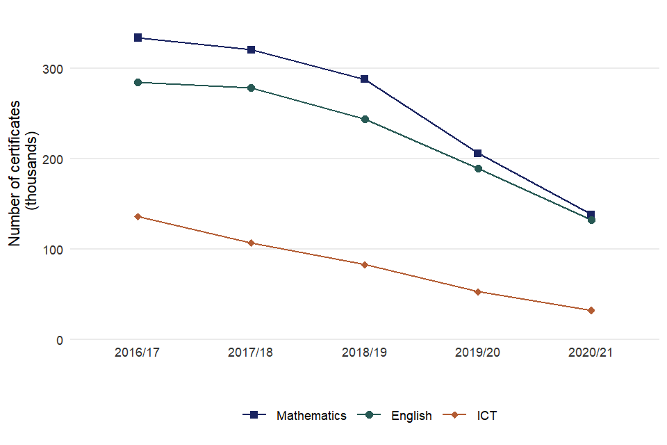 There were 12 awarding organisation issuing certificates in Functional Skills qualifications in the 2020 to 2021 academic year, down from 13 in the previous year.