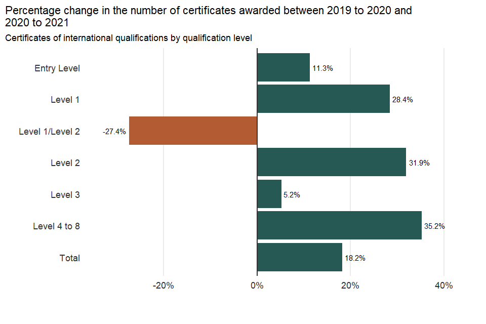 | Qualification level | Percentage change in the number of certificates awarded between 2019 to 2020 and 2020 to 2021 |