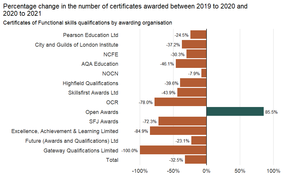 Most awarding organisations awarded fewer certificates in Functional Skills qualifications in comparison to the 2019 to 2020 academic year. Only Open Awards saw an increase in the number of certificates awarded (up by 1,200) in the 2020 to 2021 academic year compared to the 2019 to 2020 academic year.