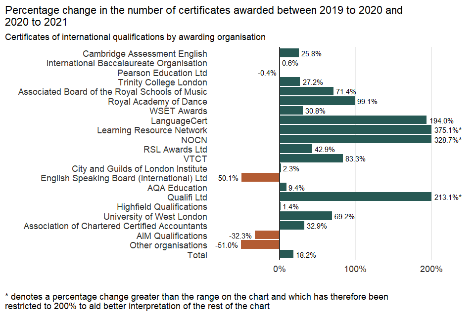 In total 5.8 million certificates were awarded for 2,600 different regulated qualifications to students outside the UK over the 2020 to 2021 academic year, up by 18% compared to the previous year.