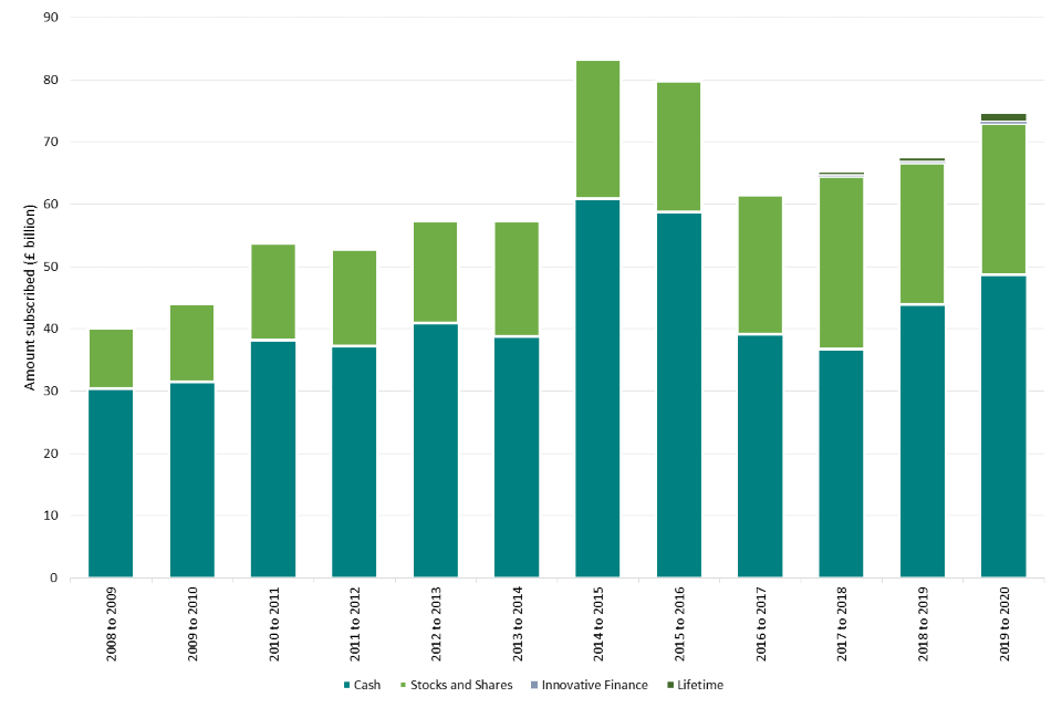 Chart 2 shows that around £75 billion was subscribed to Adult ISAs in 2019 to 2020, an increase of £7.1 billion compared to 2018 to 2019. This increase was driven by the rise in cash ISA subscriptions, which increased by £4.8 billion. The amounts subscribed to stocks and shares ISAs increased by £1.6 billion since 2018 to 2019.