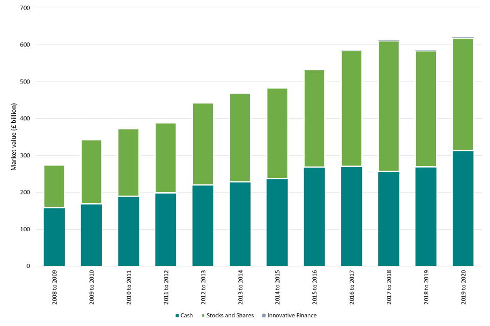 Chart 3 shows that at the end of 2019 to 2020 the market value of Adult ISA holdings stood at £620 billion. This represents a 6% increase compared to the value at the end of 2018 to 2019. This was driven by a 16% increase in the market value of funds held in cash. Stocks and shares ISA holdings account for 49% of the market value of ISA funds, a decrease of 9% from 2018 to 2019. Cash ISAs account for 51% of the market value.