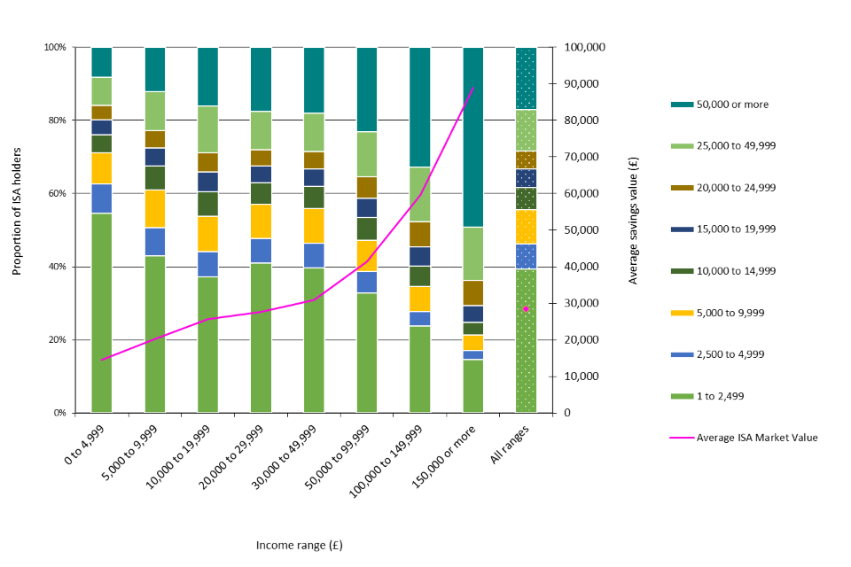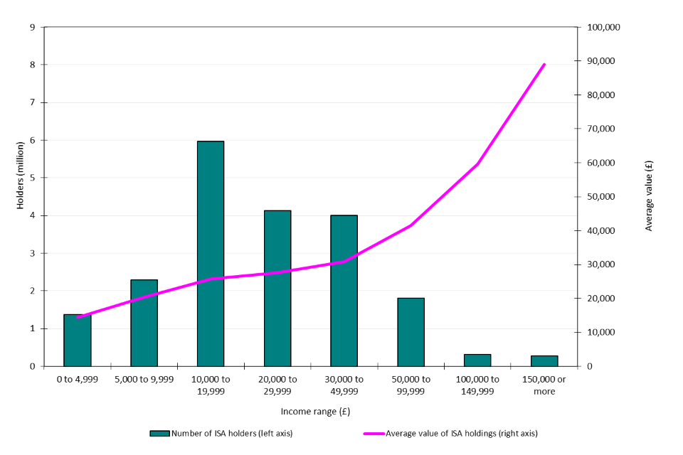 Alternatively, in households with more than one adult, earnings from one high income individual may enable other adults in the household to open an ISA account, in order to maximise the tax free return on their savings. The size of ISA holdings rises with income.