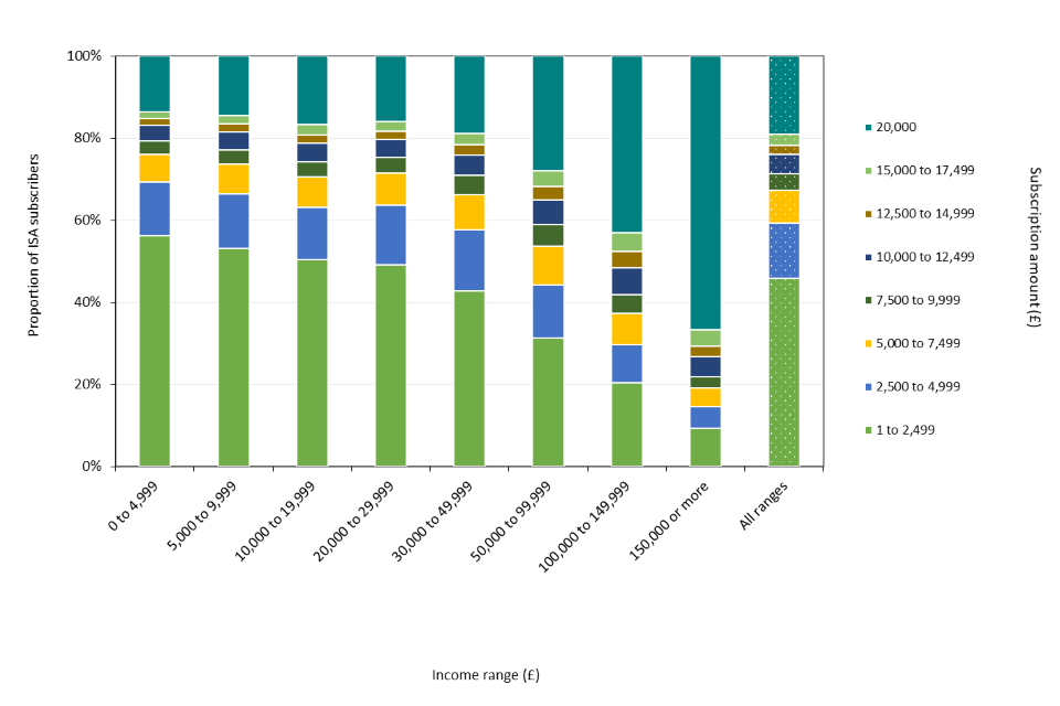 The chart suggests that some individuals may have contributed more to their ISAs than their annual earnings allow (such as those subscribing the maximum £20,000 with an income of less than £5,000). This may be possible where individuals have existing taxable savings that they are transferring into ISA accounts.