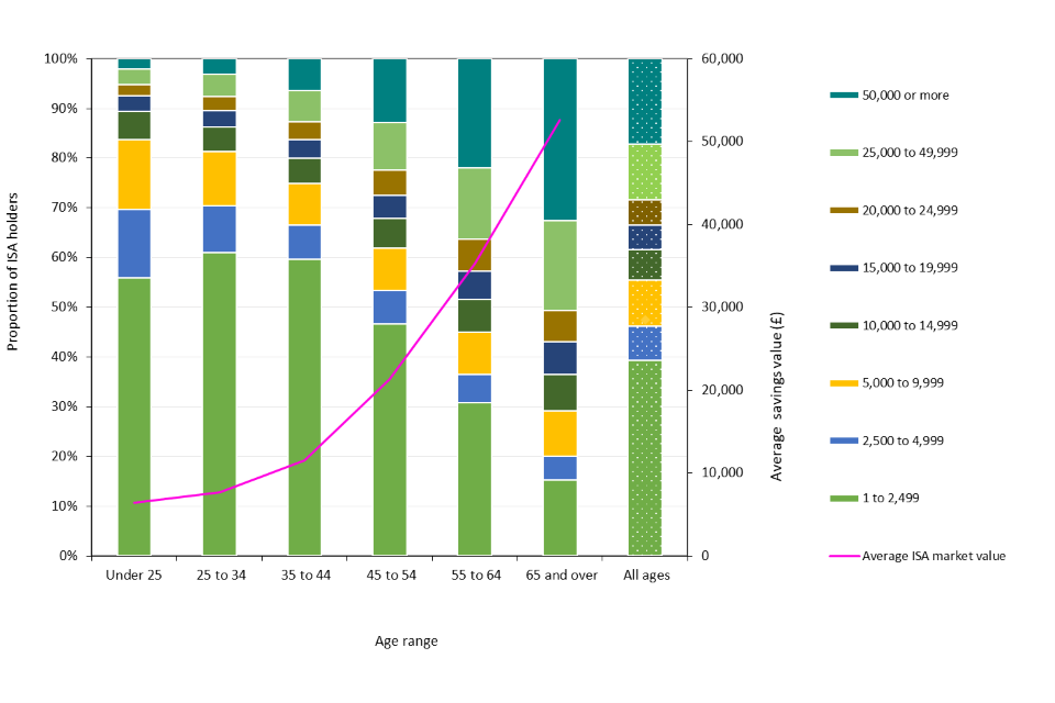 The average amount of ISA savings in the under 25 age group at the end of 2018 to 2019 was around £6,450 and the average amount of ISA savings in the 25 to 34 age group was around £7,750. This is compared with about £52,590 in the 65 and over group.