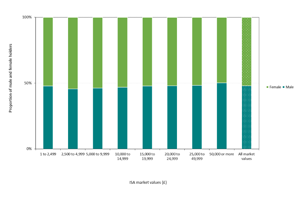 The sex split of numbers of ISA subscribers is relatively equal. Chart 9 shows that in 2018 to 2019, females accounted for a marginally higher proportion of the total ISA holdings. Females accounted for 50% of ISA holdings worth £50,000 or more, in contrast to owning 52% of holdings worth up to £2,499.