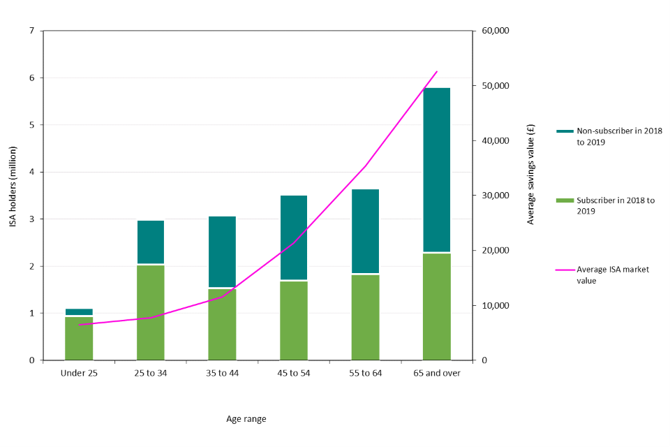 The greatest number of savers was in the 65 and over group, and this group also had the highest average ISA savings value of around £52,590. A large portion of this group (61%), however, were not active savers in 2018 to 2019.