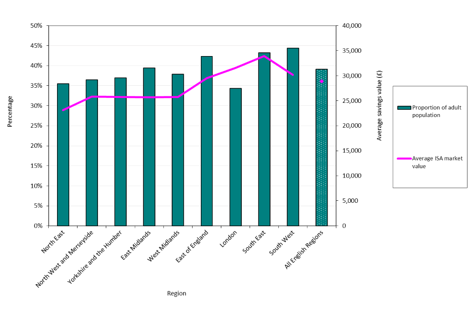 Chart 10: Proportion of population with ISAs and average holding by English region in 2018 to 2019