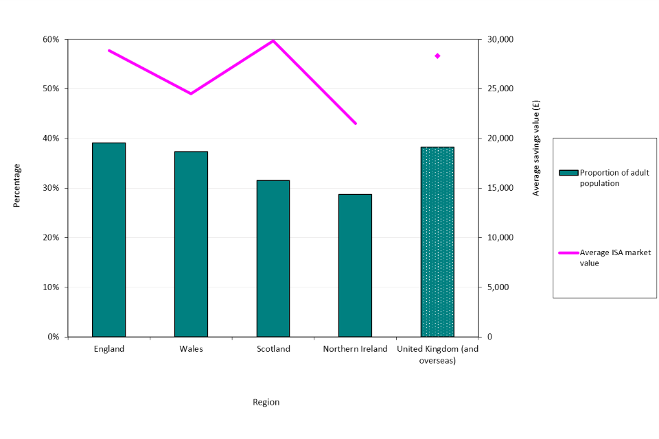 Chart 11 shows that at the end of 2018 to 2019, 39% of adults in England had an ISA. By comparison, in Wales, Scotland and Northern Ireland, 37%, 31% and 29% of adults, respectively, had ISAs. ISAs held by individuals in England and Scotland were on average higher in value compared to the rest of the United Kingdom.