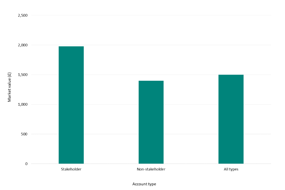 Chart 12 shows the average market value of a Child Trust Fund (CTF) in 2019 to 2020 was £1,500. The average market value of a stakeholder and non-stakeholder account was £1,980 and £1,400, respectively.