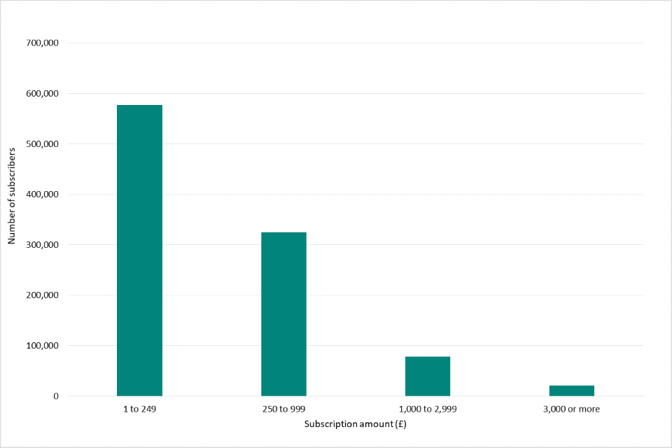 Chart 13 shows that in 2019 to 2020, the number of individuals subscribing to a CTF decreases with the size of subscription. The majority of CTF subscriptions were in the £1 to £249 band, with around 577,000 subscribers.