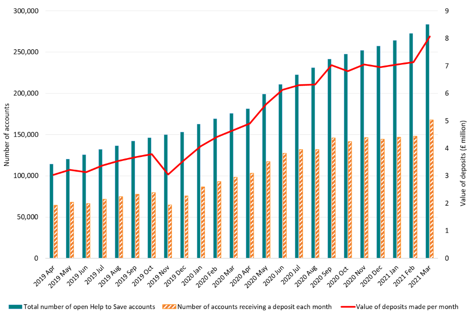 Chart 14 shows that in the past two months (February 2021 to March 2021), 19,250 Help to Save accounts have been opened. The total number of accounts opened now stands at 284,050, a 7% increase on the total number of accounts opened by the end of January 2021.